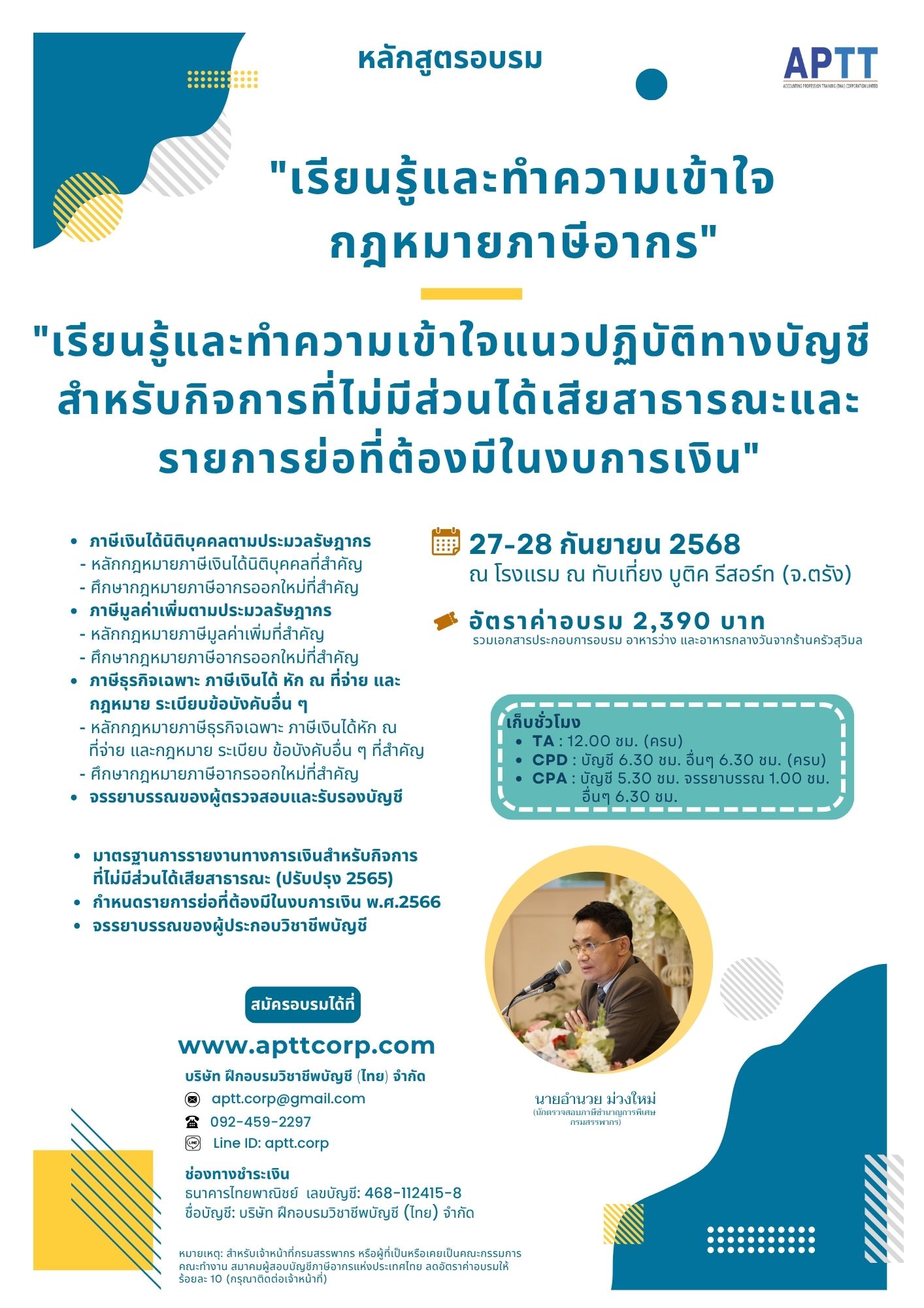 หลักสูตร "เรียนรู้และทำความเข้าใจ (1) กฎหมายภาษีอากร (2) แนวปฏิบัติทางบัญชีสำหรับกิจการที่ไม่มีส่วนได้เสียสาธารณะและรายการย่อที่ต้องมีในงบการเงิน" (รุ่นที่ 2/2568)