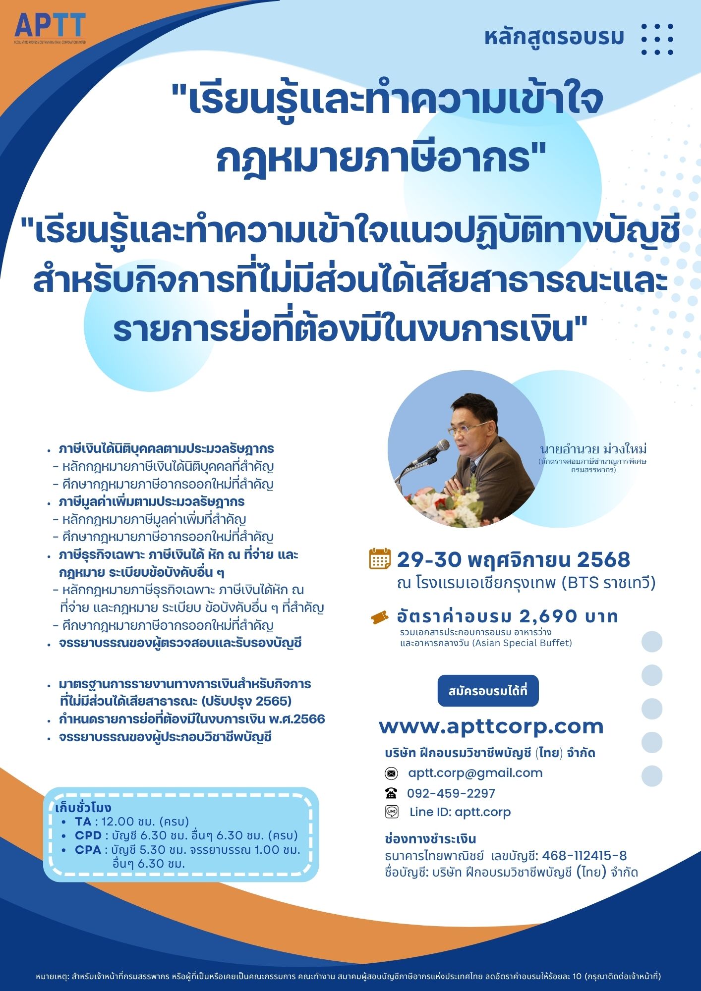 หลักสูตร "เรียนรู้และทำความเข้าใจ (1) กฎหมายภาษีอากร (2) แนวปฏิบัติทางบัญชีสำหรับกิจการที่ไม่มีส่วนได้เสียสาธารณะและรายการย่อที่ต้องมีในงบการเงิน" (รุ่นที่ 3/2568)